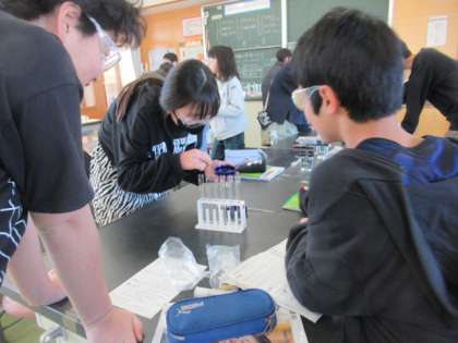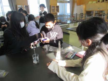 アルミニウムやスチールウールなどを使って実験しました。金属のとけた塩酸を蒸発させ、出てきた固体を比較していきます。慎重に進めています。