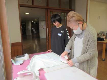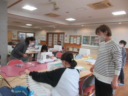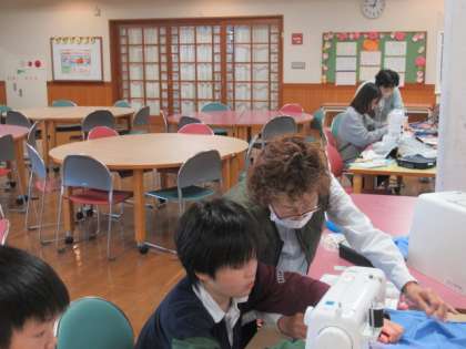 エプロンづくりに取り組んでいます。今日も、ボランティアの方においでいただきました。分かりやすいご指導のおかげで、子供たちもミシンを上手に扱って裁縫作業が進んでいます。