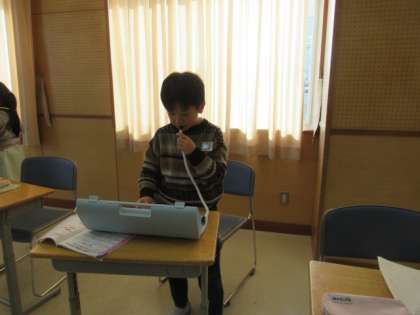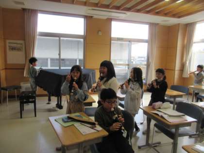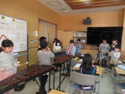 ミッキーマウスマーチを合奏しています。楽しい曲の感じを子供たちは体で感じながら演奏しています。演奏しながら行進している子供たちです。