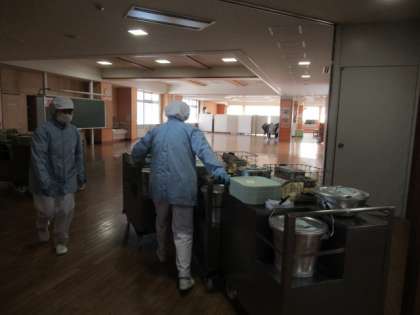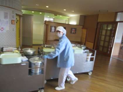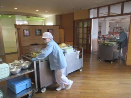 間もなく給食の時間。調理員の方々は、毎日、献立の内容に関わらず、決まった時間に調理を終え、各教室に確実に届けてくださいます。ワゴン車の移動もまさしく職人技です。