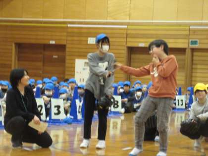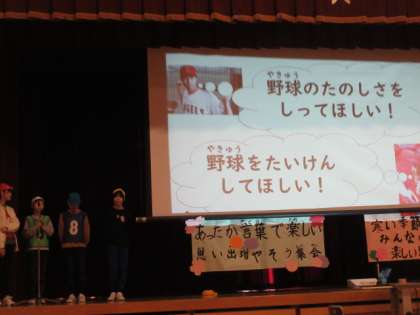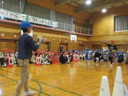 大谷選手は全国の小学生に「野球のすばらしさを知ってほしい」「野球を体験してほしい」という願いから、贈ってくださったそうです。全校児童が集った体育館で、運動安全委員会の子供たちが、遊び方(使い方)の注意を伝えてくれるとともに、実際にキャッチボールのお手本を見せてくれました。
