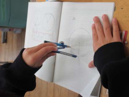 コンパスを使って円をかき、そこから三角形を描いていきます。ばっちり上手にかけました。