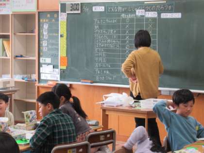 いろいろなもので試してみました。その結果を黒板に書き並べていくと、ある決まりが見えてきました。