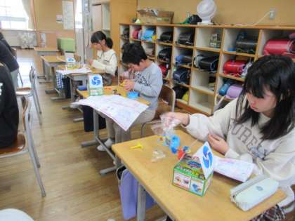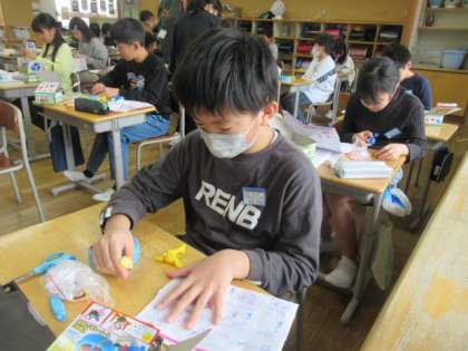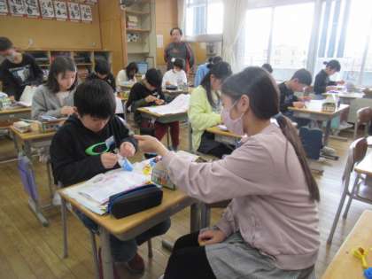 説明図をよく見て、配線をつないでいきます。友達と教え合いながら、協働作業です。