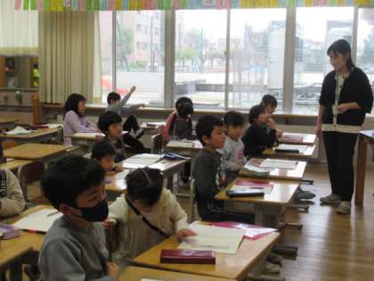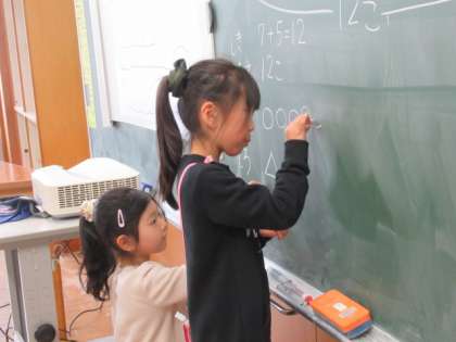たし算の問題を図に表してみます。すると、どんな式が必要かが見えてきます。前に出て積極的に書いてくれる子供たちがたくさんいます。隣の友達との情報交換もたいへん有効です。