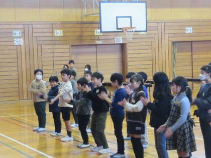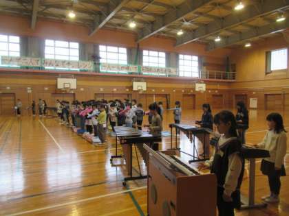 リズム遊びを楽しんだ後、合奏を紹介します。これまで学習したことをしっかりと生かした内容です。