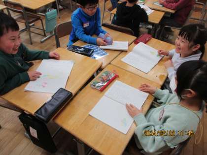 作者になってオリジナルの詩をつくりました。これまでの経験で心に残っていることを詩にしたり、自分の好きなものから想像を広げて考えたりして、子供たちらしいかわいい詩がたくさんできました。グループの友達と紹介しあって、互いの詩のよさを見つけていました。
