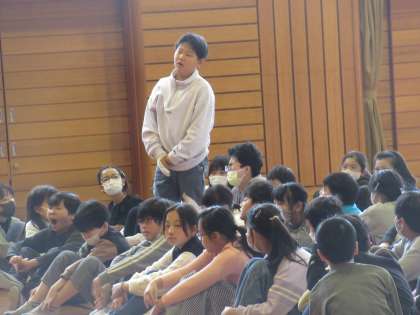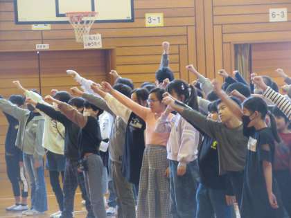 この日は、歌詞の内容から感じる歌い方の工夫や響きのある発声について考え、話し合いながら表現をつくり上げていきました。伸びやかな声が体育館に響いています。