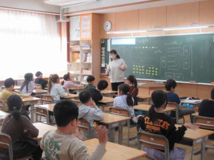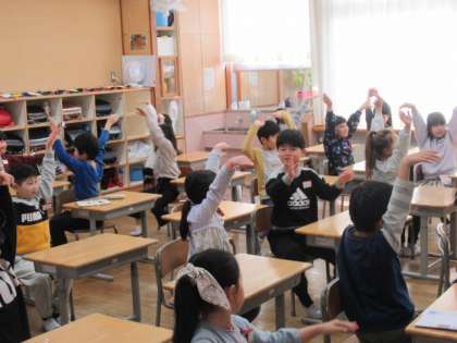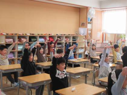 2年生では、卒業を祝う集会では、6年生といっしょに座ったままで楽しく踊ろうと企画を考えています。本番は明日。教室でも練習しています。