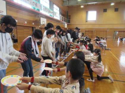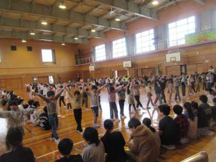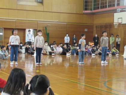 6年生の卒業をみんなでお祝いする集会が始まりました。1年生の子供たちは、マツケンサンバを元気に踊りました。そして最後にお礼のメッセージをバシッと6年生にプレゼントすることができました。