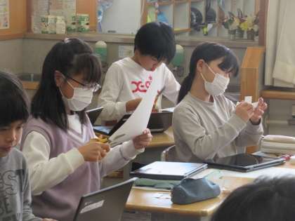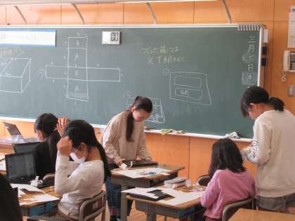 隣り合う面の関係、そして反対側にある面は図面ではどこに位置すればよいのか、見取り図の書き方で学んだ知識を生かして実際に立体をつくってみました。いろいろな大きさの立体が出来上がりました。