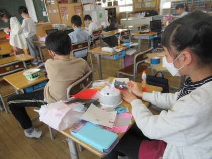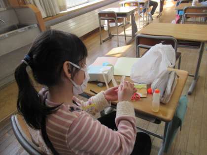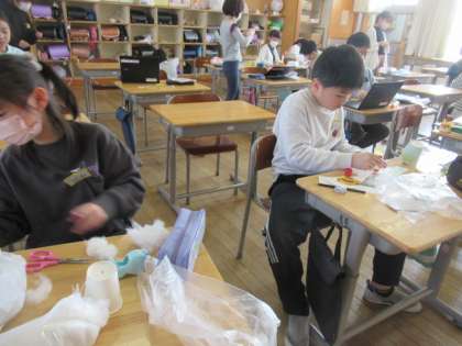 ゴムの性質を使っておもちやをつくります。楽しそうなおもちゃが着々と出来上がってきています。