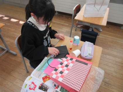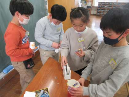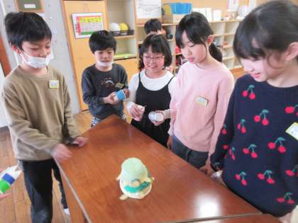 図画工作科の学習で、ゴムの力で動くおもちゃをつくって遊びました。前に進んだりポンポン跳ねたりする動きを楽しみました。
