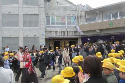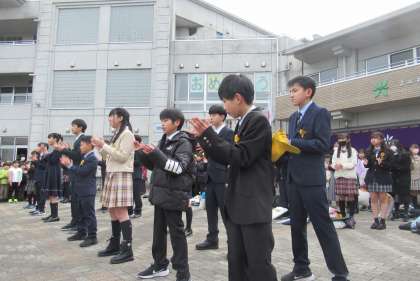 卒業式が終わり、最後の学活を過ごした6年生がいよいよ巣立ちます。在校生、保護者のみなさん、来賓の方々全てがにこさわ広場に集い、6年生の見送りをしました。在校生を代表して、5年生「光陽応援団」がエールを贈りました。また、6年生もお返しのエールをしてくれました。大きな拍手を受けながら、中央の花道を通って、6年生は笑顔で光陽小学校を出て行きました。