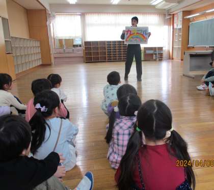 2年生の学年目標「カラフル」に込めた思いを伝えたり、転入生の紹介をしたりしました。これから1年間、よろしくお願いします。