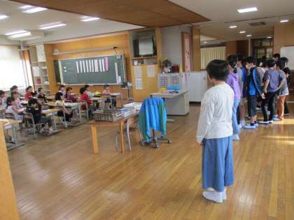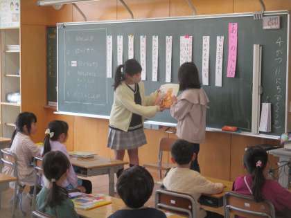 お兄さん・お姉さんらしく優しく、1年生に朝の準備を教えていました。
