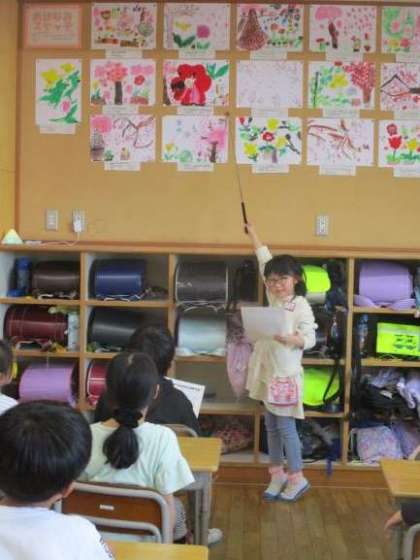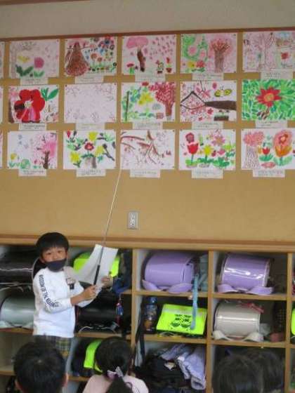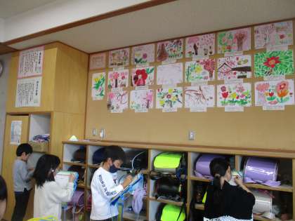図工の時間にかいた絵の鑑賞会をしました。子どもたちは、色や形、デザインの工夫などたくさん見付けていました。