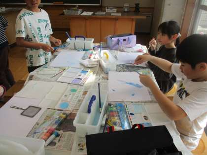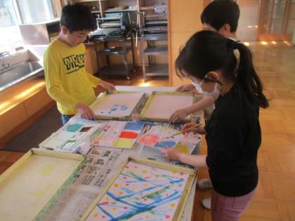 図画工作科の学習では、スタンピングやスパッタリング等の様々な技法を使い、偶然できる形を楽しみながら作品をつくりました。