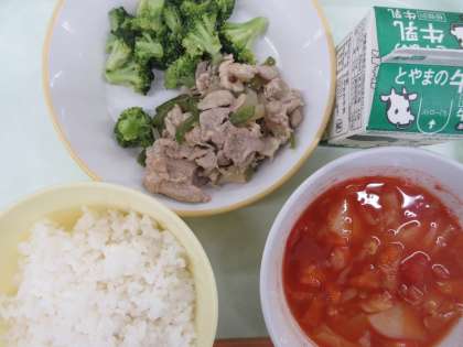 今日の献立は、ごはん ポークソテー ゆでブロッコリー 白いんげん豆のトマト煮 です。