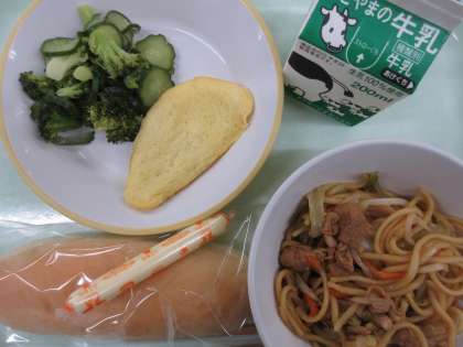 今日の献立は、コッペパン オムレツ ドレッシングサラダ 焼きそば 棒チーズ です。