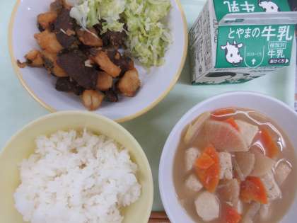 今日の献立は、ごはん、魚とレバーの揚げからめ、ゆでキャベツ、ごまけんちん です。