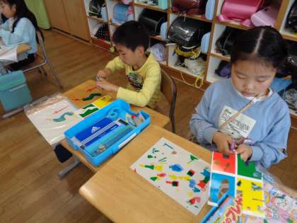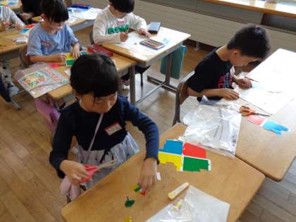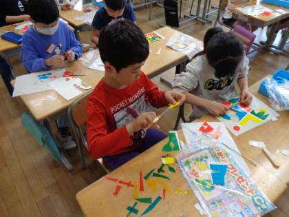 図画工作科「ひかりのプレゼント」では、光を通して楽しいものを考えて作品づくりを進めています。色を重ねたり形を工夫したりしています。