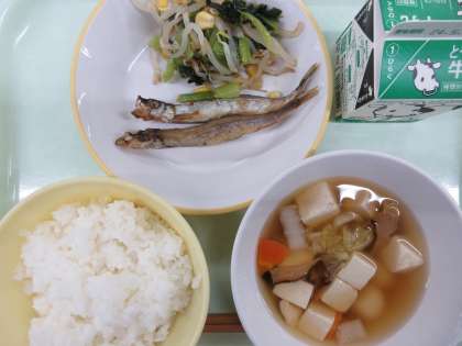 今日の献立は、ごはん 牛乳 ししゃものから揚げ コーン和え 白玉汁 です。