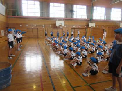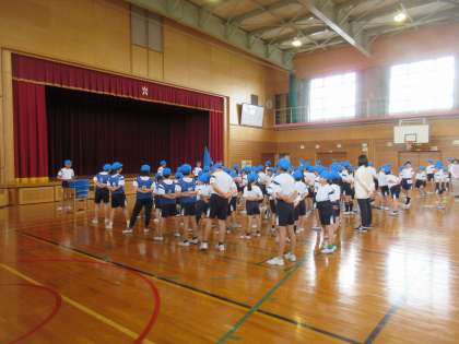 体育館で練習する青団の様子です。6年生のリーダーシップのもと、下級生もしっかりと指示を聞いて活動していました。