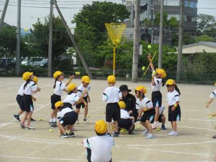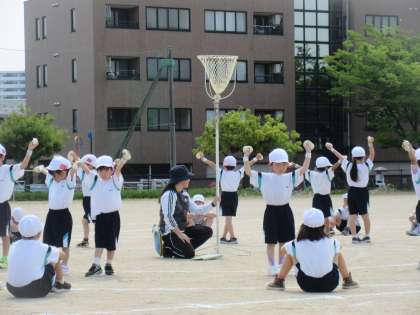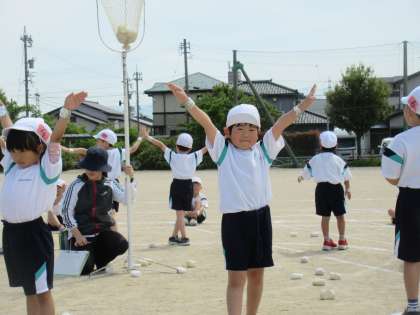 1、2年生による「サンバでおどろう!!みんなで玉入れ」。お馴染みのあの曲で可愛らしく踊り、思い切り玉を入れていました。