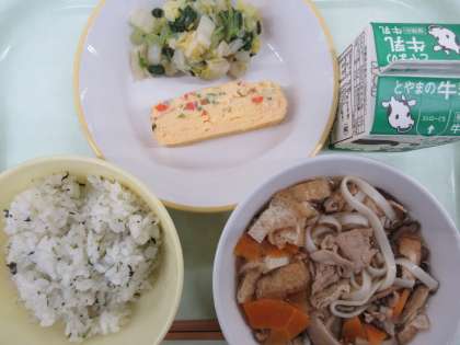 今日の献立は、菜めし 牛乳 千草焼き おひたし かやくうどん です。