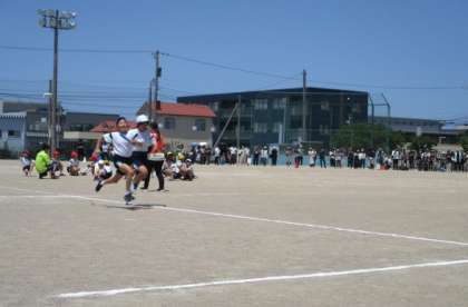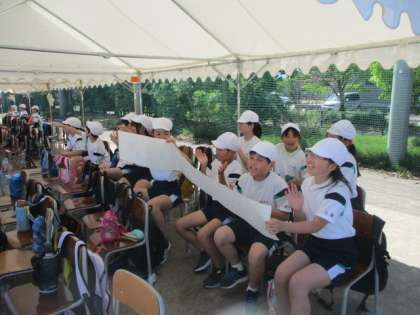 70メートル走、タイヤ引き、選抜リレー、応援合戦、どの競技も全力で頑張る5年生でした。団席でも、大きな声援を送っています!