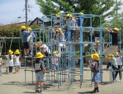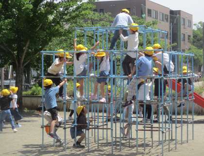 本日は、とってもよい天気でした。遊具広場で遊ぶ子供たちです。時間とやくそくを守りながら、友達と楽しく遊んでいました。