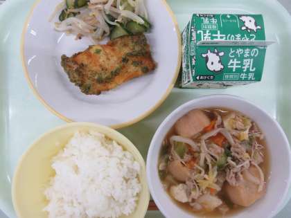 今日の献立は、ごはん 牛乳 魚の磯辺揚げ 甘酢和え すきやき です。