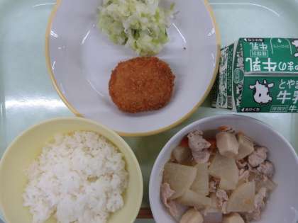 今日の献立は、ごはん 牛乳 コロッケ ゆでキャベツ 大根のみそ煮込み です。