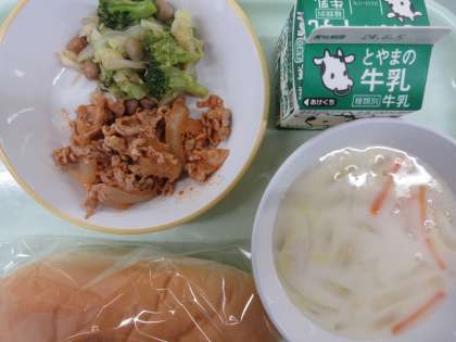 今日の献立は、コッペパン 牛乳 ポークチャップ ビーンズサラダ クリームスープ です。