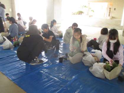 4年生が花植えを行い、遊歩道に並べました。地域の皆様及び保護者の方々、ご協力ありがとうございました。