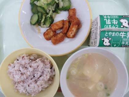 今日の献立は、雑穀入りごはん 牛乳 いかのかりん揚げ 華風和え すいとん です。
