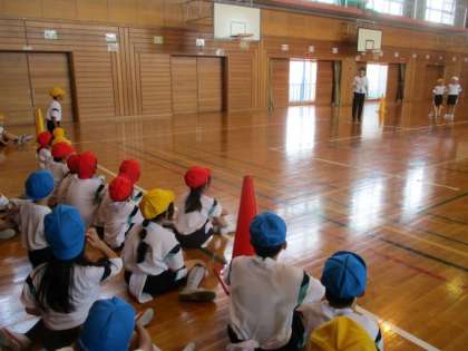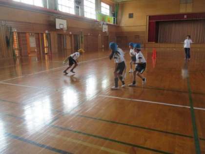 体育の学習で、しっぽとりゲームをしました。子どもたちは、相手にしっぽをとられないようにするにはどう動けばいいのか、いろいろな作戦を考えていました。