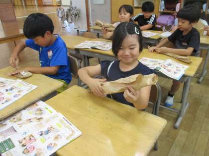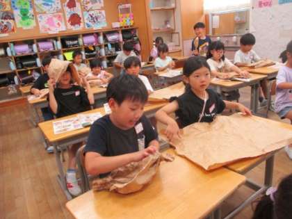 紙をくしゃくしゃっとしたり、丸めたり、ねじったりして遊びました。1枚の紙から、あざらしやロケットなど、いろいろな形が生まれました。