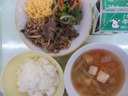 今日の献立は、ビビンバ(ごはん 焼き肉 ナムル 錦糸卵) 牛乳 中華スープ です。