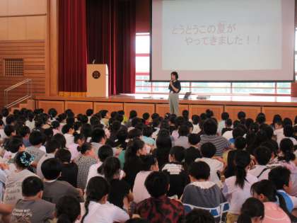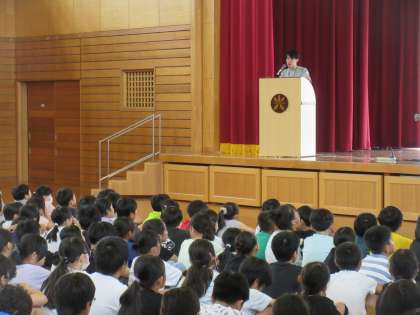 学習を始めるにあたって、全校でプール開きの会を行い、代表児童の言葉を聞いて目当てを確かめたり、約束を確認したりしました。