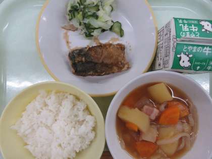 今日の献立は、ごはん、牛乳、魚の梅風味かば焼き、合わせ和え、ベーコンとじゃがいもの煮物 です。