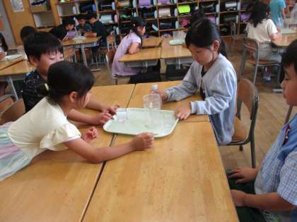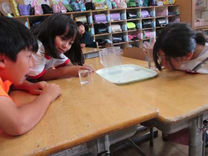 1dLのますを使って、二つのペットボトルの水のかさを調べました。グループの友達と協力して、何dL入るのかを調べました。