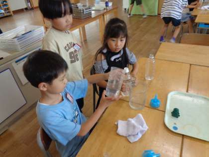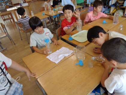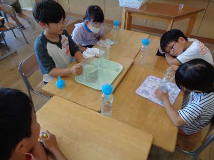算数科で、「1dL」「1L」「10mL」を実際に計ってみました。班のみんなで協力し、「1L」が「10dL」であることを確かめました。