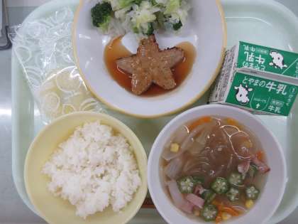 明後日7月7日の七夕にちなみ、星の形をしたハンバーグ 春雨を天の川に見立て、おくらで星を表した天の川スープの、夜の星空をイメージした献立です。