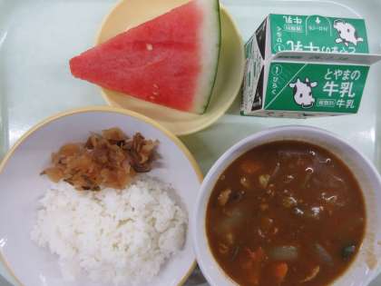 今日の献立は、ごはん 牛乳 夏野菜カレー ふくしん漬け すいか です。カレーには、 たまねぎ、人参等の定番野菜の他、かぼちゃ、なす、トマト等の夏野菜が入っています。