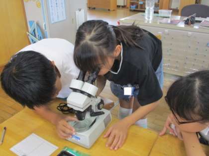学級で育てているメダカのたまごを観察しました。子供たちは顕微鏡の使い方にも慣れて、たまごの中の様子を興味津々に見ています。