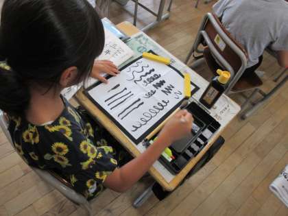 くるくる、ぎざぎざ、くねくねの線を書いたり、好きな絵を描いたりして筆に慣れた後、自分の名前の練習をしました。