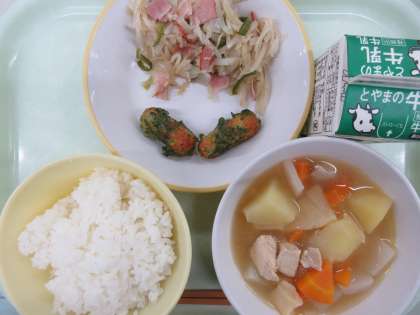 今日の献立は、ごはん、牛乳、ちくわの磯辺揚げ はりはりソテー 鶏肉とじゃがいもの南蛮煮 です。