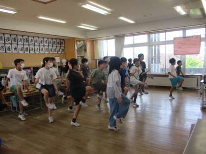 5年生では、宿泊学習に向けて体力つくりウィークをしています。毎朝、ダンスや階段の上り下りに取り組んでいます。いい汗かきましたね!!
